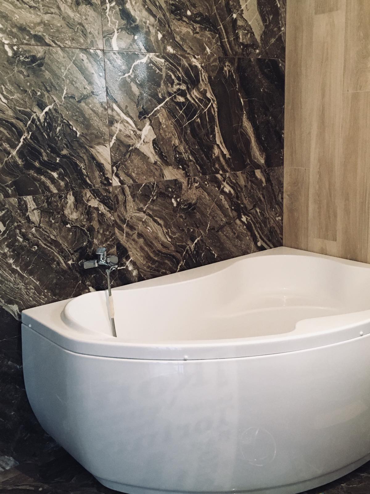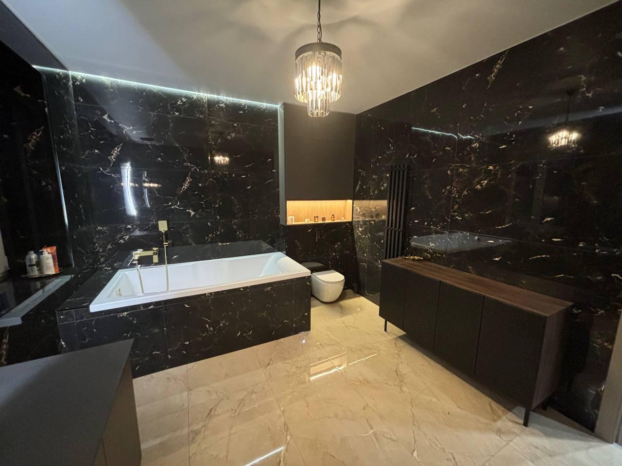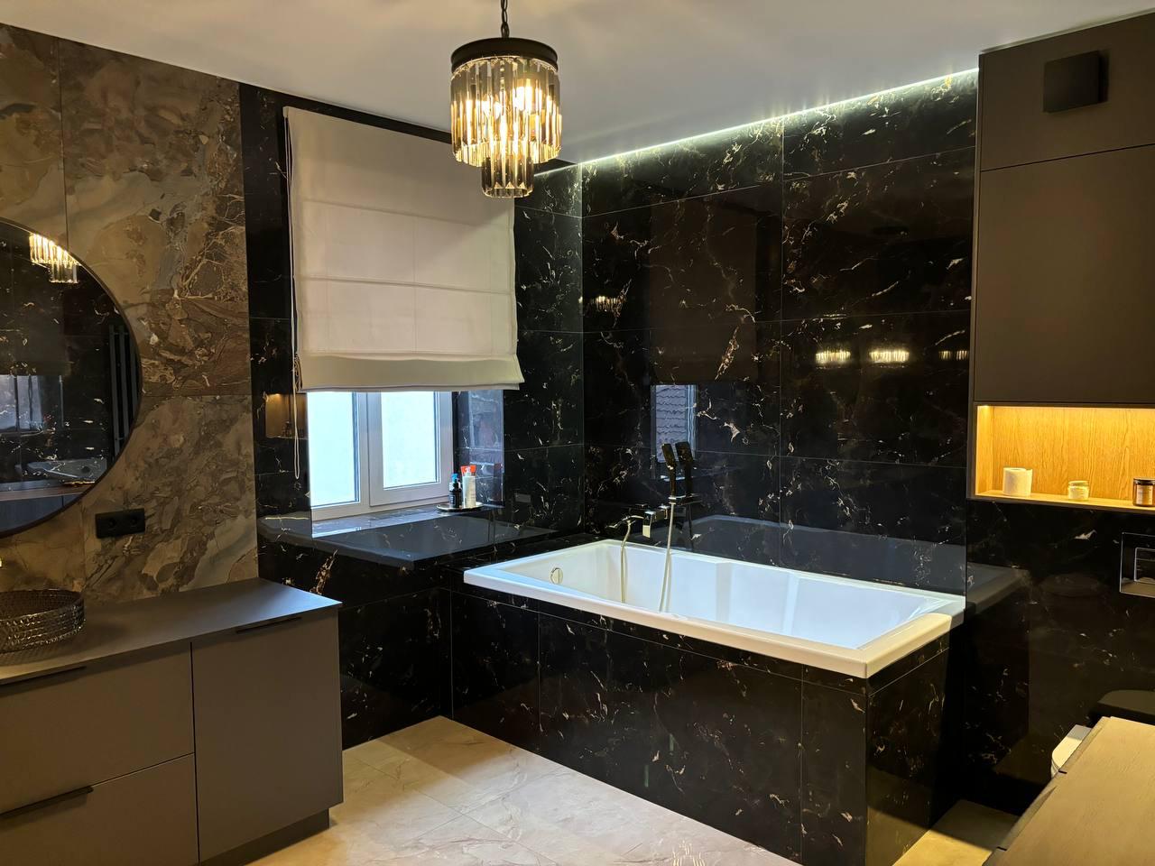 Ванная комната, декорированная мрамором и деревом