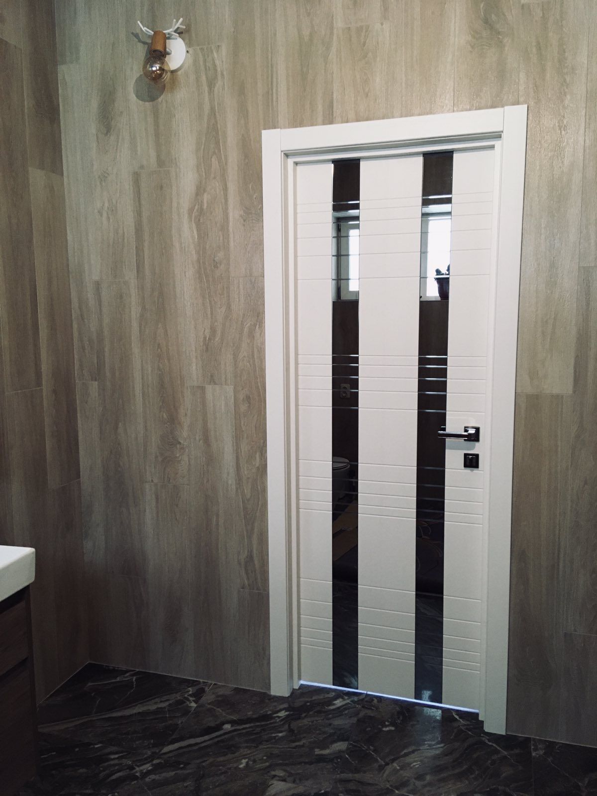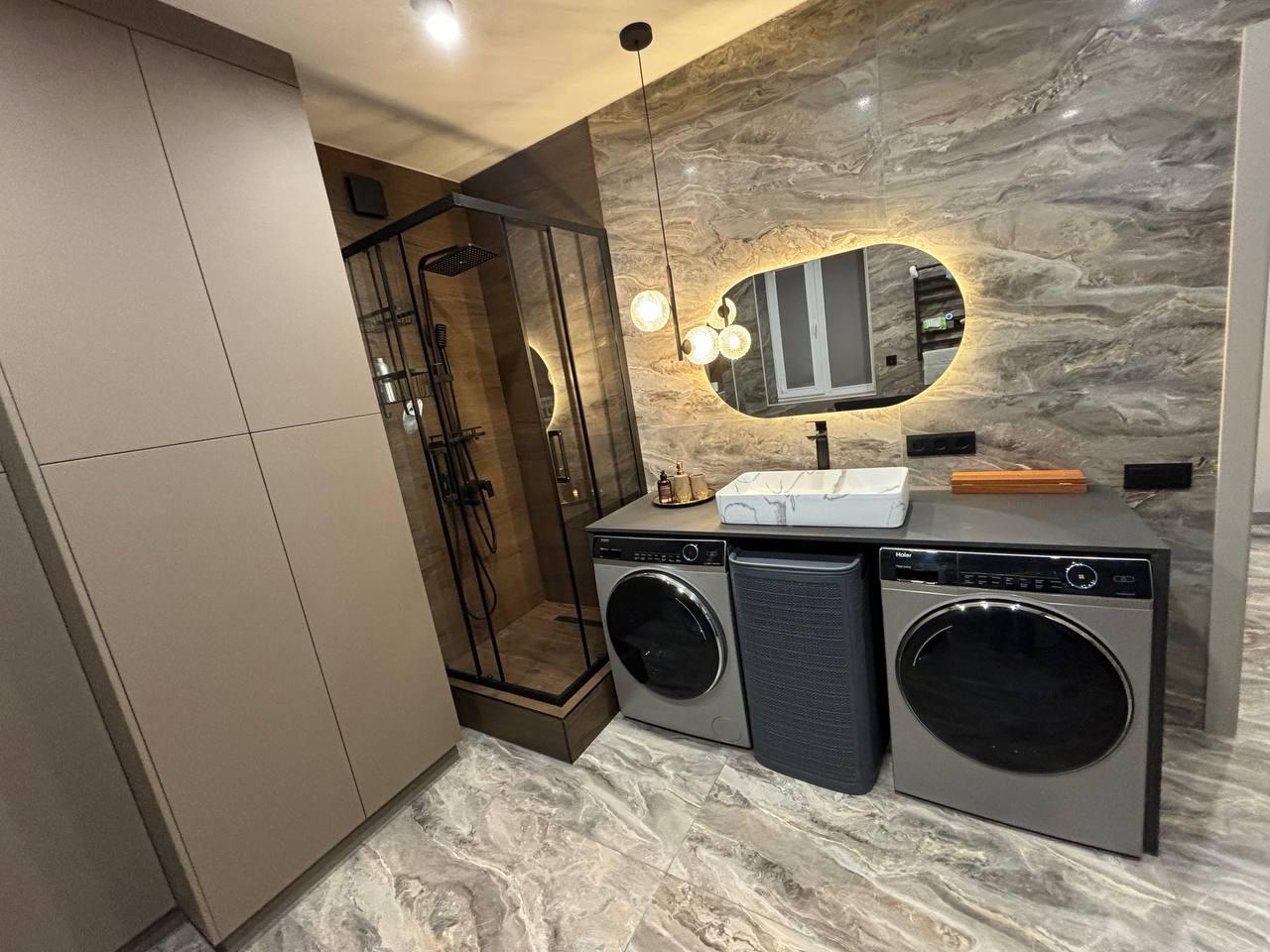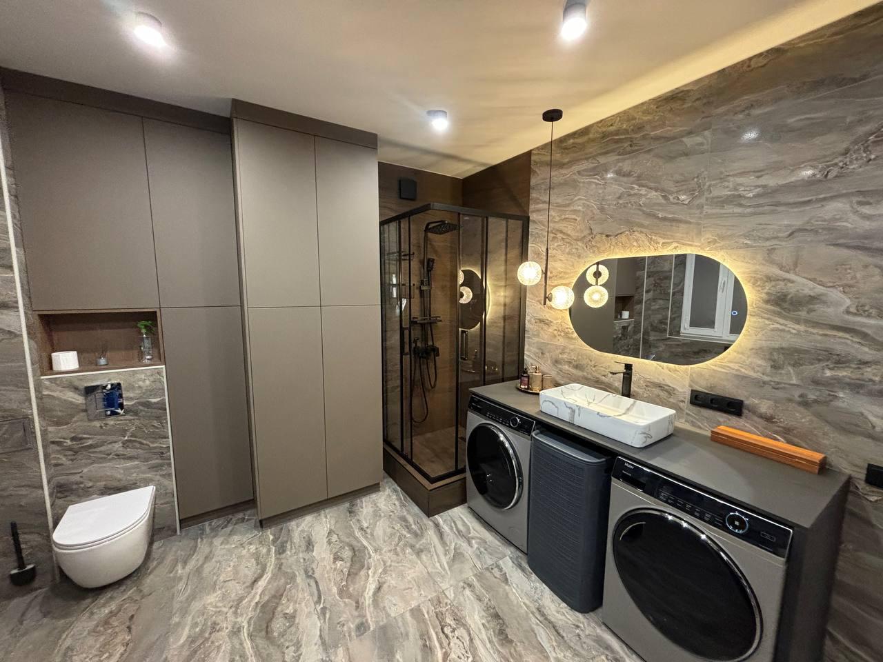 Ванная комната, декорированная мрамором и деревом
